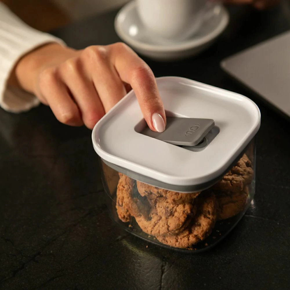 Seu tamanho reduzido é ideal para completar a organização de armários, gavetas e prateleiras. O design quadrado e modular permite empilhar facilmente com outros potes da linha, otimizando o espaço e criando uma estética uniforme e sofisticada na cozinha.